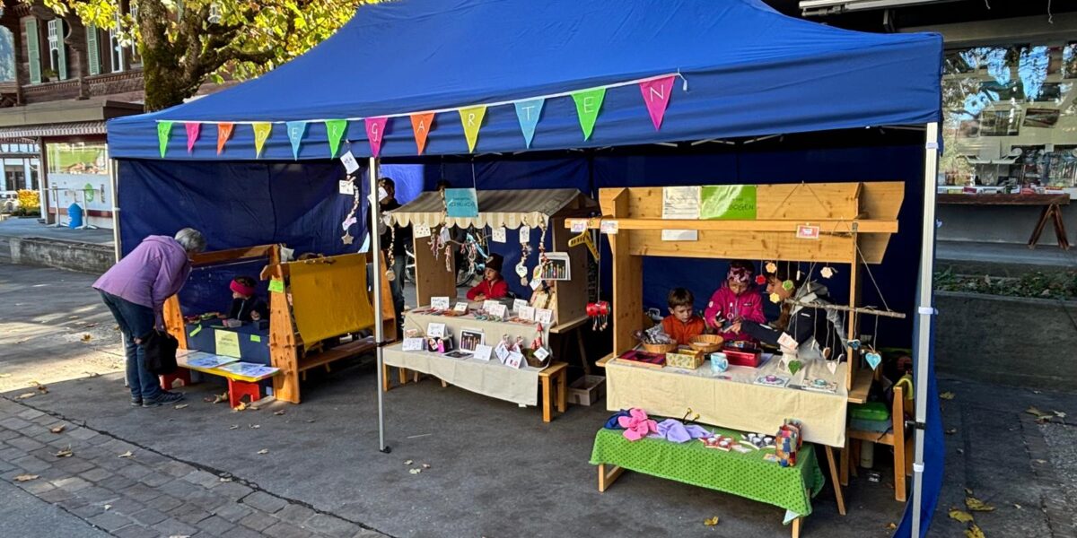 Im Regenbogen-Kindergarten wurde vorgängig am «-Spiel-Märit- Stand» das Märitleben geübt und das Geld thematisiert. Sie produzierten aus Ton hübsche Mobiles und fertigten selbst Holzpuzzle an. Lustige Marienkäfer aus Konservendosen und bezaubernd schöne Tassen standen auch auf dem Verkaufstisch. Nicht fehlen durften auch die feinen getrockneten Apfelringe und Bruchschokolade für den Genuss.