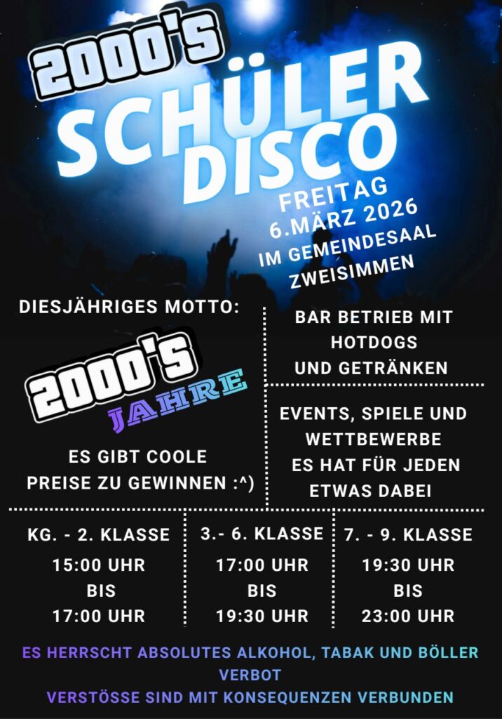 Die Schülerdisco findet unter dem Motto “2000’s Jahre” am 6. März 2026 statt. Es gibt ein Gewinnspiel mit coolen Preisen, Hotdogs und Spiele.